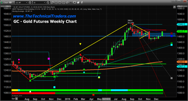 This last Weekly chart of gold highlights the Weekly Fibonacci Price Modeling system and the core support near $1480 to $1510 (the Blue Box/Line). This level of support is identified by the BLUE Fibonacci Price Modeling System retracement target (Square). We believe the breakdown in price after the Pennant/Flag formation in late October was investor/news-driven as the US Fed announced lower interest rates and the new cycle continued to push “US/China Trade Deals Soon” topics. This was a way to settle investor's nerves and distract them from the underlying market dynamics.