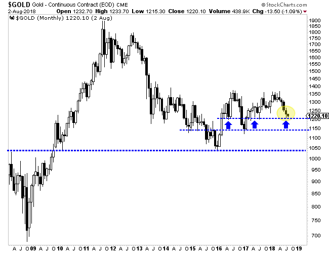 The primary trend for precious metals is lower. However, the monthly charts show that gold, silver and the gold stocks are in different positions. For example, gold remains comfortably above its December 2016 low and because of good support at $1200, could hold the recent low for a few months. The gold stocks are in a different position because they are dangerously close to breaking support which has been tested numerous times over the past 18 months. It's possible a rebound in gold could prevent a breakdown…but it's also possible the miners could crack as gold struggles to show any strength, albeit while holding support. Silver, which is often a leading indicator for the sector has already broken down.