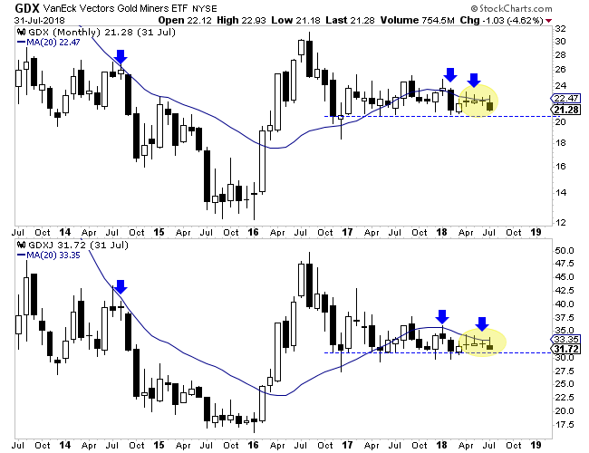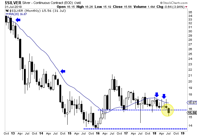 Silver, unlike gold and gold stocks has already broken down and lost support from its December 2016 low. Its July close was its lowest monthly close in more than two years. The next strong support level is the previous major low in the $13s.