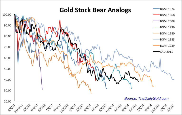 Gold’s bear market has been severe to this point but not when judged through the lens of history. The bear analogs below suggest Gold has more downside potential and could easily make a new low. If and when the weekly low of $1200 breaks, Gold could plunge to its bottom within a few weeks. Keep an eye on $1080, which is the 50% retracement of the entire bull market.