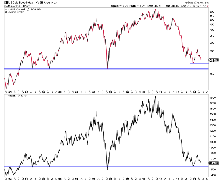 The bears analog chart argues that gold stocks could make a double bottom or perhaps a marginal new low. In my opinion, a new low would be a false new low. The next chart is a weekly plot of the HUI and GDM, the forerunner to GDX. The support (or buy) targets are quite clear.