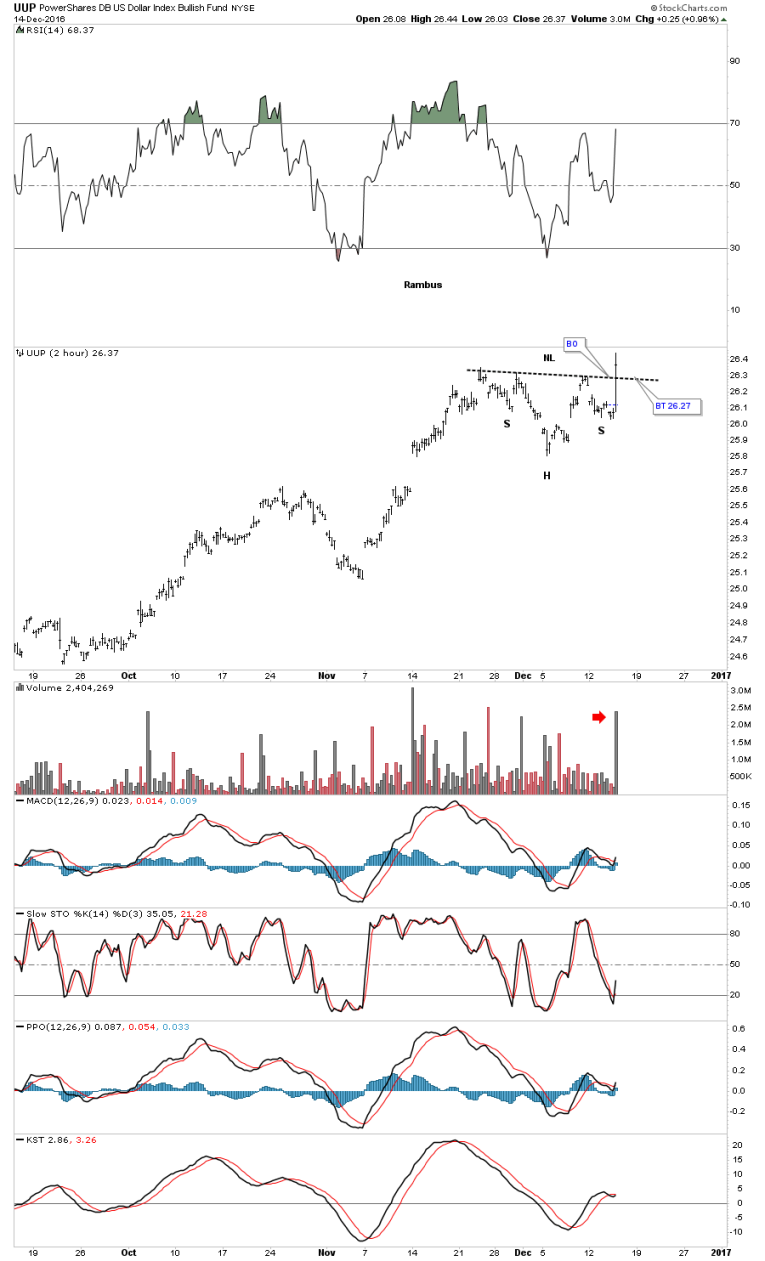 First I would like to start by looking at the two hour chart for the UUP which broke out of a H&S consolidation pattern today during the last two hours of trading on heavy volume. I know there are many reasons why the US dollar can’t keep going up, but the H&S consolidation pattern has formed as a backtest to the top rail of the year and a half bull flag. Below is the two hour chart for the UUP.