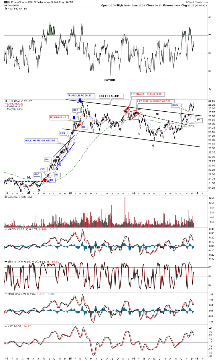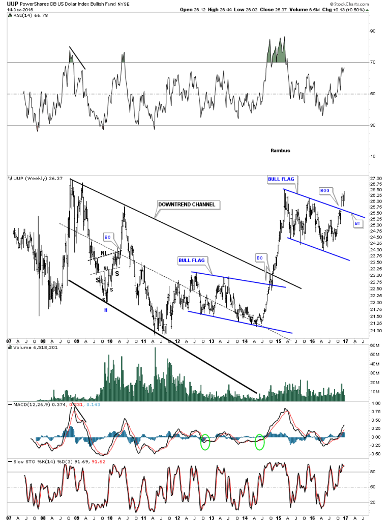 This last chart for the UUP is another long term weekly look which shows the initial downtrend channel that formed between 2008 and 2014. Note the blue bull flag that formed just below the top rail of the black downtrend channel which gave the UUP the energy it needed to finally breakout and run to the high made in 2015, which began our recent consolidation pattern.