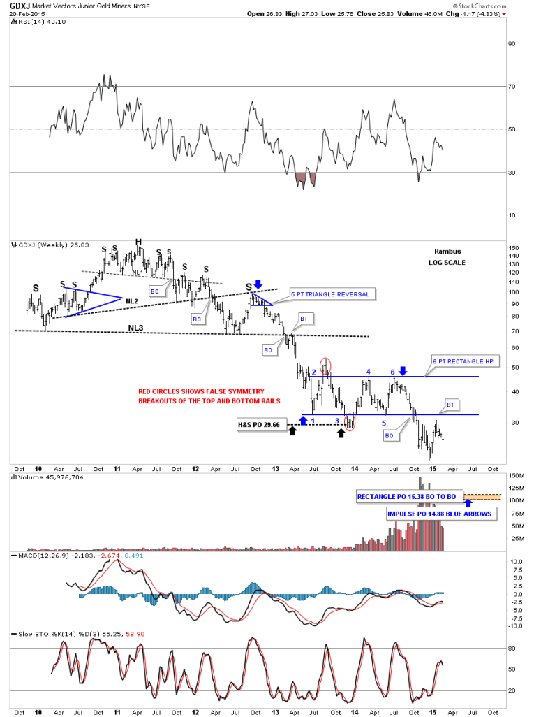 This last chart for the GDXJ is a weekly look where I took the liberties to change the lower consolidation pattern that started to form in 2013. I have shown you many times in the past how a chart pattern can have what I call a false symmetry breakout of the top and bottom rails. Here you can see the two red circles, one on top and the other below, which if you erase them you would get a very symmetrical 6 point rectangle consolidation pattern. As you can see the rally off of the November low has fallen just shy of reaching the bottom rail, of what I’m labeling as a 6 point rectangle consolidation pattern for now, as the backtest. If the rectangle plays out as a halfway pattern to the downside you can see the brown shaded area at the bottom of the chart that has two price objectives using the impulse method, blue arrows, and the breakout to breakout method. Interesting times.