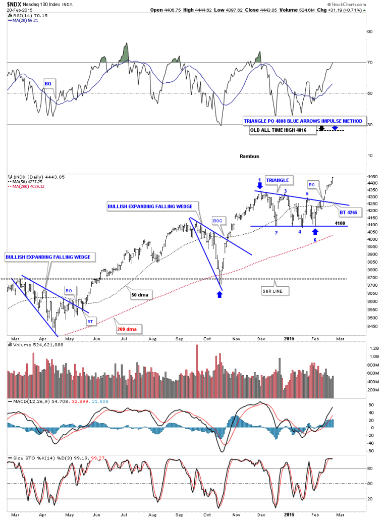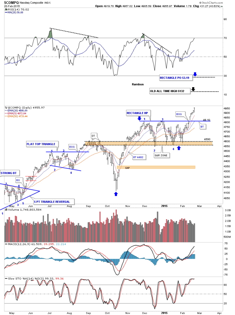 Next I would like to show you some of the different stock markets as many are breaking out to new all time highs. The first one is a daily chart of the COMPQ that shows the blue rectangle consolidation pattern that broke to the upside seven days ago with a breakout gap and no backtest so far. You can see I have two price objectives at the top of the chart. The blue one is how I would measure the blue rectangle has a halfway pattern as shown by the blue arrows. The lower black price objective is its all time highs made back in 2000. Normally when you see such an important high like this a stock will initially find resistance at the old high. Even in a strong market there will be a lot of sellers at that point. This should be a good guide to take some profits off the table. Hopefully we may see a small consolidation pattern form just below the all time high at 5132 before the COMPQ breaks out to new all time highs.