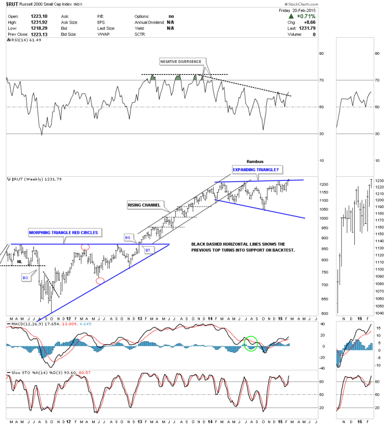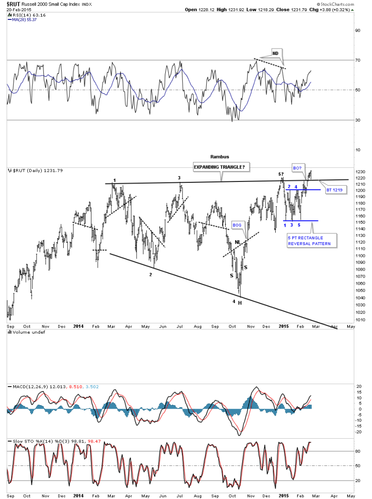 The daily chart for the RUT 2000 shows it breaking out above the top rail of the massive blue expanding triangle. I just tweaked the top rail a bit. Note the spike high just before the top rail was touched 2 weeks ago and sold off. That’s is typical on the initial hit. After the backtest to the top rail of the blue rectangle it then rallied up and through the top rail of the expanding triangle. Note the last bar on this chart which I’m now labeling as the backtest to the top rail of the blue expanding triangle. Until the weakness last Friday morning I had the top rail just a bit higher but seeing the low on Friday shows me where to the backtest actually occurred. We shall see if this is the correct position now for the top rail on any further backtesting.
