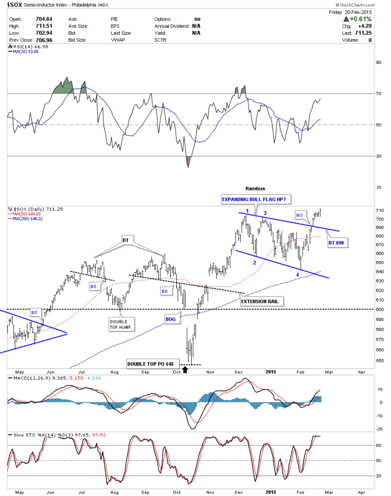 The daily chart for the SOX index shows it breaking out of an expanding bull flag. A backtest would come at the top rail around the 690 area.