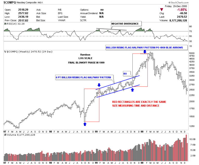 Next I would like to show you a slightly different way to use these rectangles to show a price and time objectives. These rectangles measures each impulse leg with a halfway pattern in the middle. Sometimes they can work out extremely well but the main point to take away from these charts is it gives you a place to start looking for the move to end. Below is a weekly chart for the COMPQ that showed you where to begin looking for a top during the tech bubble in 2000. This was an extremely bullish setup as the halfway pattern was a bullish rising flag. The red rectangles measures each leg of the final blow phase in that bull market.