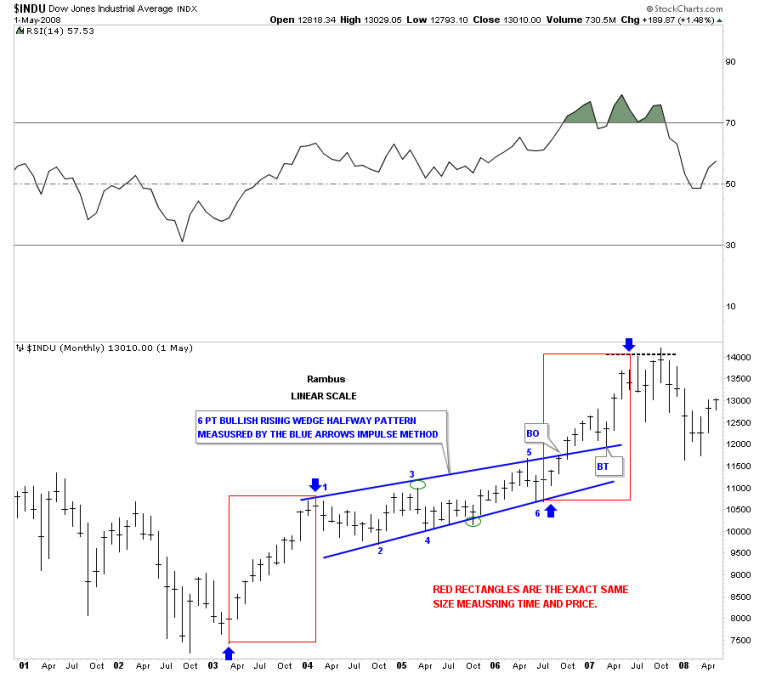 Below is a monthly chart for the INDU which shows a similar setup to the chart above but this time it was the rally phase off of the 2003 crash low. As you can see the INDU formed a blue bullish rising wedge as its halfway pattern that gave me a place to look for a top of some kind to start forming in 2007 as shown by the red rectangles that are exactly the same size. As you know that top ended up being the top that led to the 2008 – 2009 crash low.
