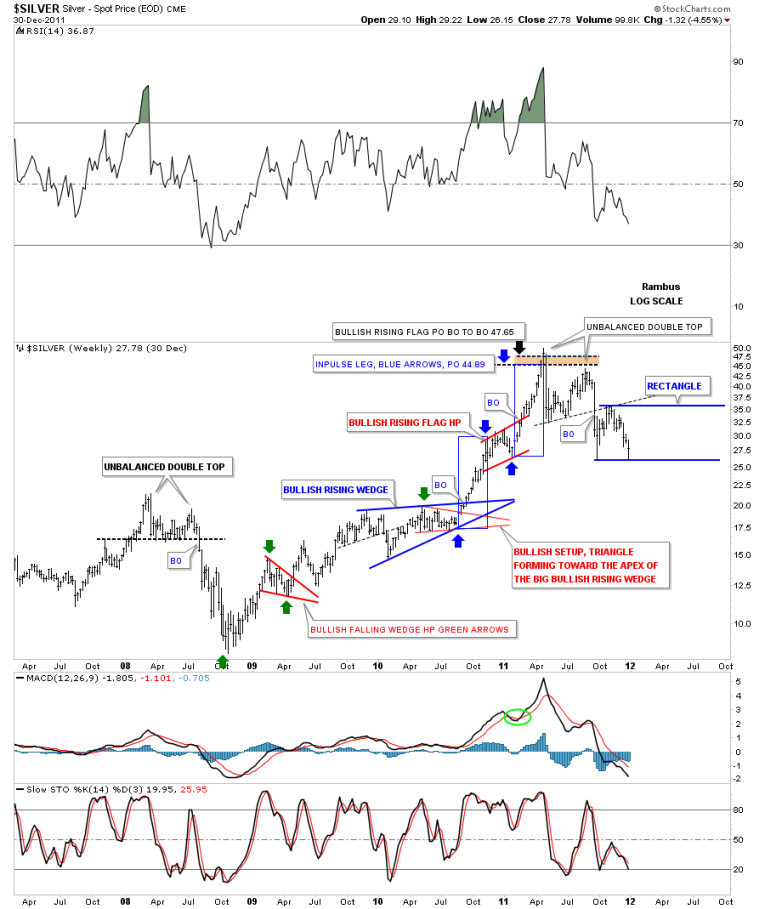 The next chart that shows how these rectangles can measure time and price is the weekly chart for silver that shows the parabolic move to its bull market high in April of 2011. Here you can see how the 2 blue rectangles measured each half of the impulse move up separated by the red bullish rising flag. Again it gave me a place to start looking a for some kind of top to begin forming. I also used the BO to BO method which came in just a tad higher at 47.65 or so. Time wise it showed April as the month for the high.