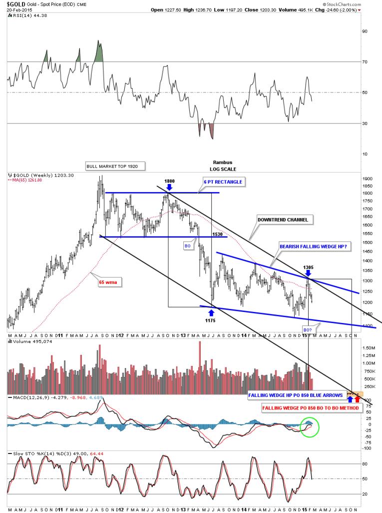 Now I would like to come full circle and put this technique into practice by looking at a long term weekly chart for gold in log scale. If you recall the HUI:SPX ratio chart showed a bottom in October of this year. The time and price rectangles on the COMPQ and INDU showed each half of their impulse move up was separated by a bullish rising flag and wedge, respectively, which told us the move was very strong. Gold has yet to break down out of its possible bearish falling wedge but until gold can trade back above the 1305 area a bearish falling wedge is what I”m labeling this chart pattern with the last reversal point being at 1305. The black rectangles measures each half of the impulse move down as shown by the blue arrows. The lower black rectangle shows us a price objective down to the 850 area that should occur sometime in October of this year. If the bearish falling wedge breaks out close to where I have it labeled the BO to BO method would also give us a price target down to the 850 area. Just to give you an idea of where I think we’re at look at the top blue arrow at 1800 and count down about 5 weeks or so. There is still a lot of work gold has to do to reach it price objective but if the 1305 is the last reversal point in the falling wedge then we are in about as close to the high as you can get. It’s now all about watching the price action to make sure nothing important has changed.