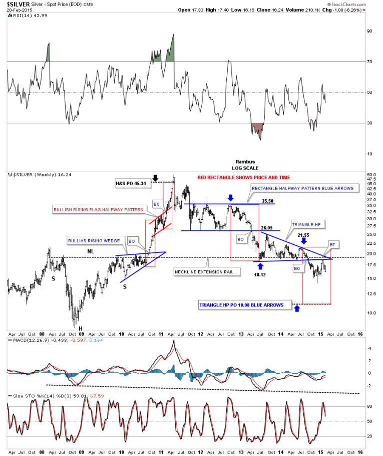 Lets now take a weekly look at silver again this time going back to 2007 which shows a H&S consolidation pattern similar to the one gold formed back then which launched its final parabolic run. On the left hand side of the chart you can see the H&S bottom with the right shoulder being the blue bullish rising wedge. The H&S called for a price objective up to the 45.34 area which coincides pretty close to the red rectangles price and time objectives with the red bullish rising flag forming at the halfway point. You may have noticed that once these time and price rectangle patterns complete there is usually a big trend reversal that takes place. This is a very important clue to know in advance as we should be able take advantage of the situation as we see the price entering into the price objective. Silver has been leading to the downside as it broke out of its blue triangle halfway pattern last September and had a backtest move that ended about 5 weeks ago. It will be interesting to see how this one plays out as it is so far ahead of gold and the PM stocks.