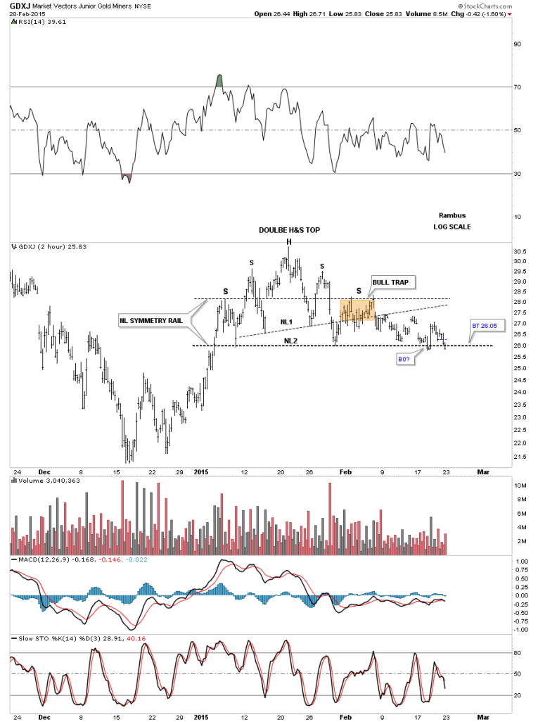 Now lets focus in on the GDXJ and some of the different chart patterns I’ve been showing starting with this 2 hour chart that shows the double H&S top and the brown shaded area I showed as a possible bull trap between the neckline symmetry rail and just above NL1. This possible H&S top is starting to become pretty unbalanced so the price action needs to break below NL2 and get the show on the road.