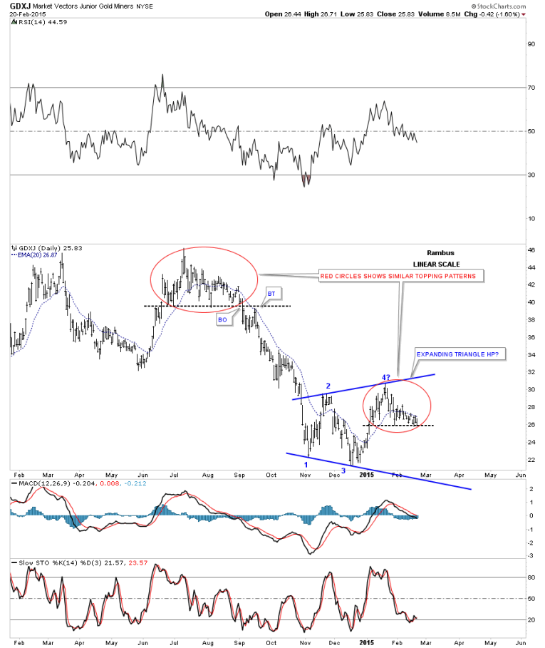 Below is a daily chart I posted a week or so ago that shows how similar the two tops are as shown by the red circles. These patterns don’t have to play out exactly but you can see what happened to the higher topping pattern after it broke below the horizontal support line. About 2 weeks later there was a backtest to the underside which would have scared off most folks invested in JDST. The GDXJ is currently sitting on the black dashed S&R line which it needs to break to the downside so we can move on to the next leg lower. Also you can see I’ve labeled the rally off of the November low as an expanding triangle which is different from the big cap PM stock indexes as they show a clear double bottom. This tells me the GDXJ has been weaker than the big caps and will probably make a lower low first. We shall see.