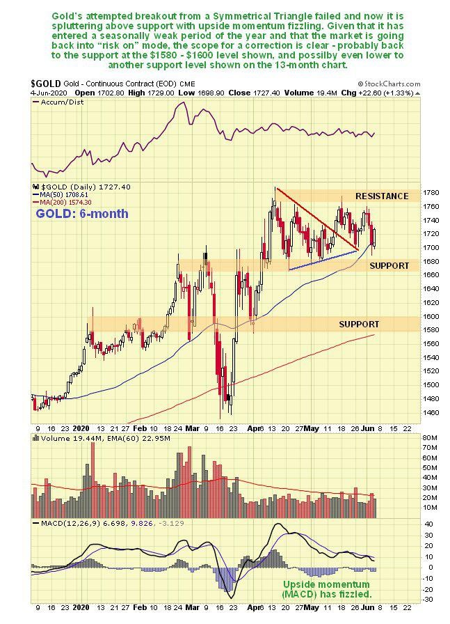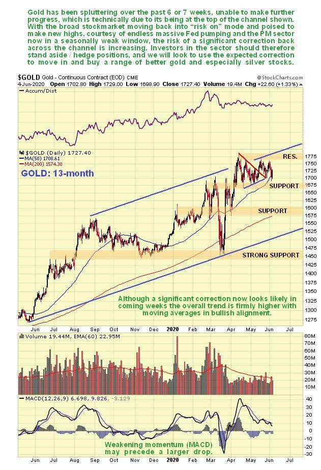 The Precious Metals sector is now set up for a correction that could be quite severe, which is evident on the charts, but also made more likely by the fundamentals where we see a return to “risk on” as a result of ongoing massive money injection by the Fed coupled with this being a seasonally weak Summer period for the metals ahead of their seasonally strongest time which runs from late July through September. The return of “risk on” will be greatly encouraged by the stockmarket breaking out to new highs which will suck money out of the PM sector to be deployed in biotech, blockchain, the FAANGS and the better cannabis stocks, but it should return as the economy gets going again and all the newly created money starts to drive inflation sharply higher.