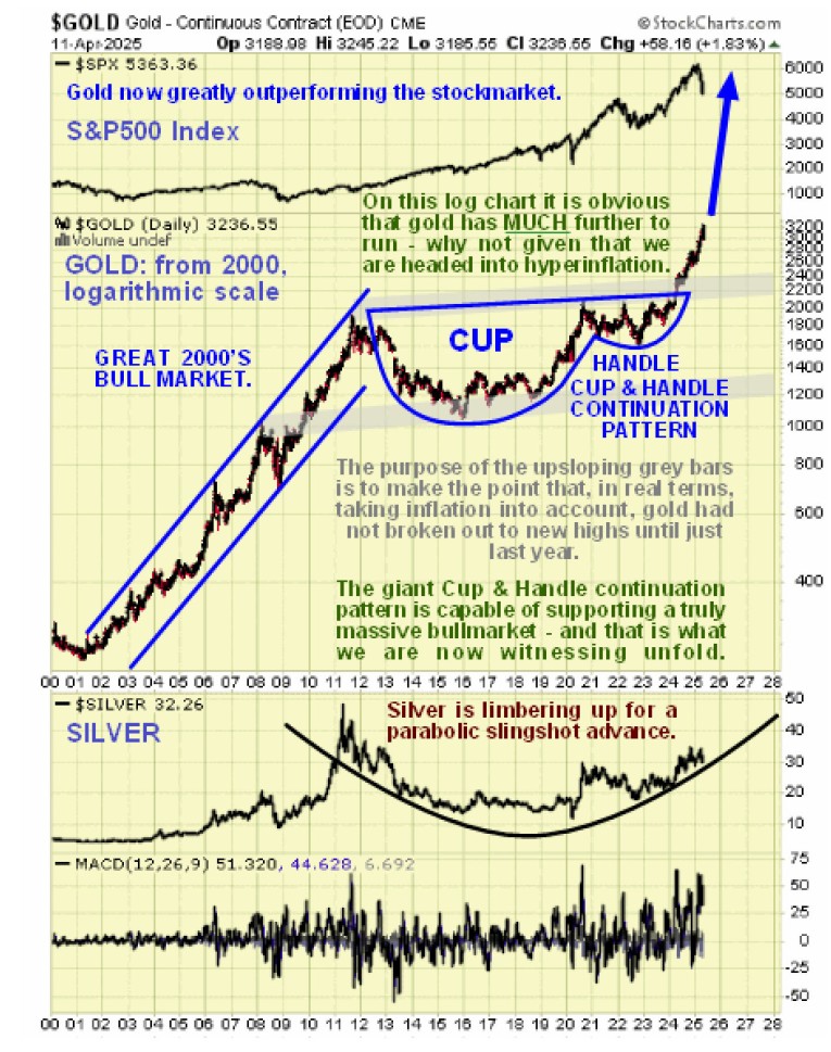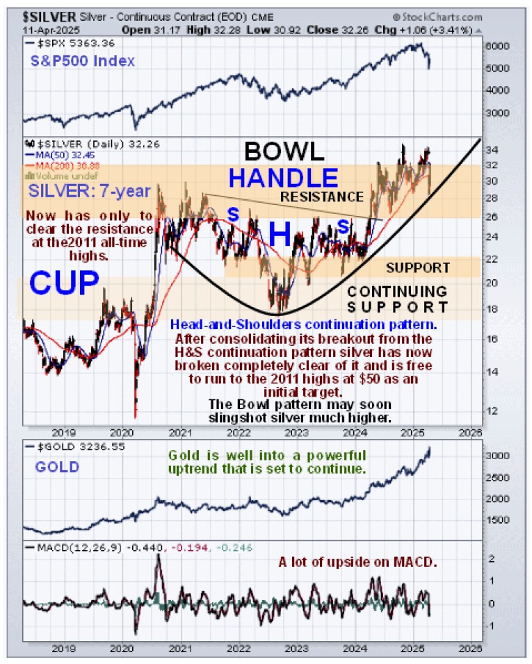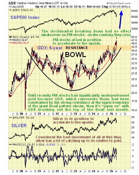 Lastly, the 5-year chart for the US dollar index shows us a big reason why the Precious Metals are likely to accelerate away to the upside. Last week the dollar broke down from a large top area and having done so is vulnerable to a severe decline. This is hardly surprising given that the rest of the world is looking to ditch the dollar after Trump’s tariff rampage of the past several weeks and bearing in mind that trillions more dollars are set to be spirited into existence to effect a massive bailout of failing hedge funds.