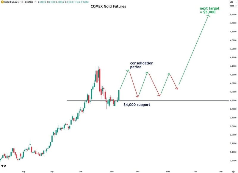 On November 5th, I pointed out what appeared to be a bullish double-bottom pattern forming on gold’s 2-hour intraday chart. I noted that it needed confirmation through a decisive close above the neckline resistance at $4,060 on COMEX gold futures.