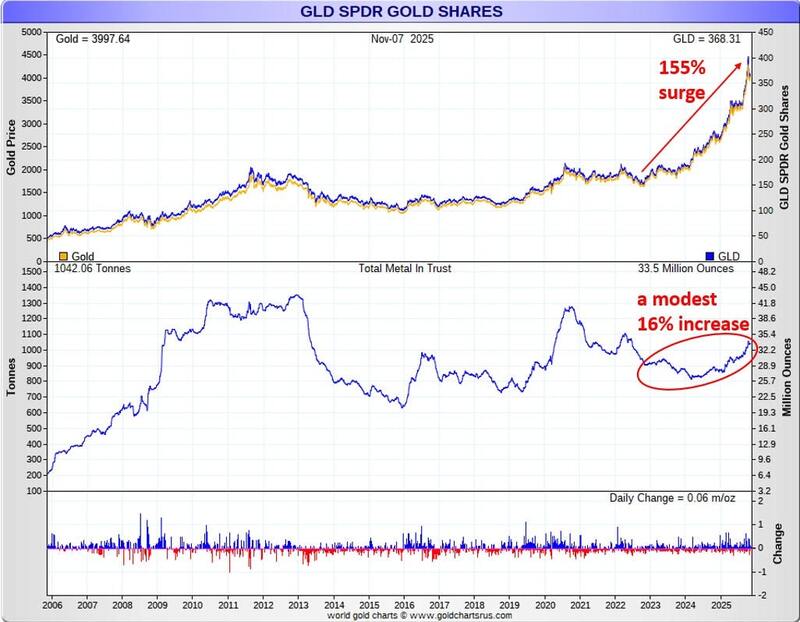 What really supports the bullish case for gold and why this bull market is still in the early stages is that American investors have been slow to participate, even despite the strong price increase. This can clearly be seen in the holdings of the popular GLD ETF, which have increased by only a modest 16% since gold’s bottom in October 2022, while gold has surged 155% over the same period.
