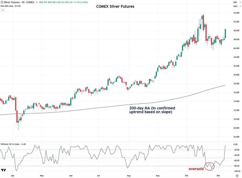 Next, let’s look at silver, which briefly became oversold in late October while still holding a strong confirmed uptrend, as indicated by the upward-sloping 200-day moving average. This was a clear bullish signal. That signal proved correct, as silver jumped an impressive 4.5% yesterday, erasing a good portion of its mid-October pullback.
