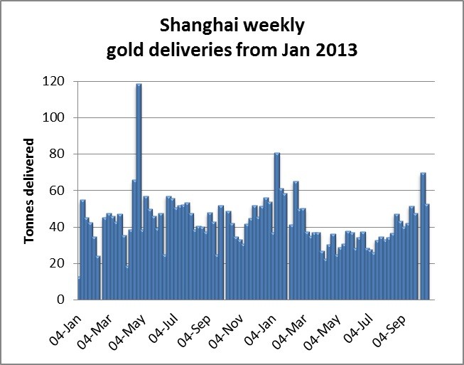 So it has been panic over for the moment in the markets and back to business as usual for precious metals. However there are signs of good underlying demand for physical gold, with the Shanghai Gold Exchange delivering 68.37 tonnes into public hands over the holiday period (two weeks with only five trading days), and a further 51.5 tonnes last week. The chart below shows gold withdrawn from the SGE this year, totalling 1,547 tonnes so far, on course for a 1,900 tonne total this year, only 300 tonnes short from the 2013 total.