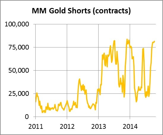 Russia continues to add to her reserves, taking them to nearly 1,150 tonnes making her the fifth largest official holder. Ignoring all this positive news of physical gold passing from weak into strong hands, the Managed Money category on Comex still has near-record short positions as shown below.