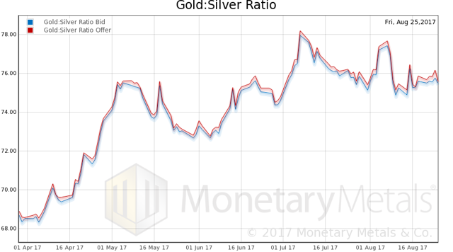 Next, this is a graph of the gold price measured in silver, otherwise known as the gold to silver ratio. The ratio barely budged.
