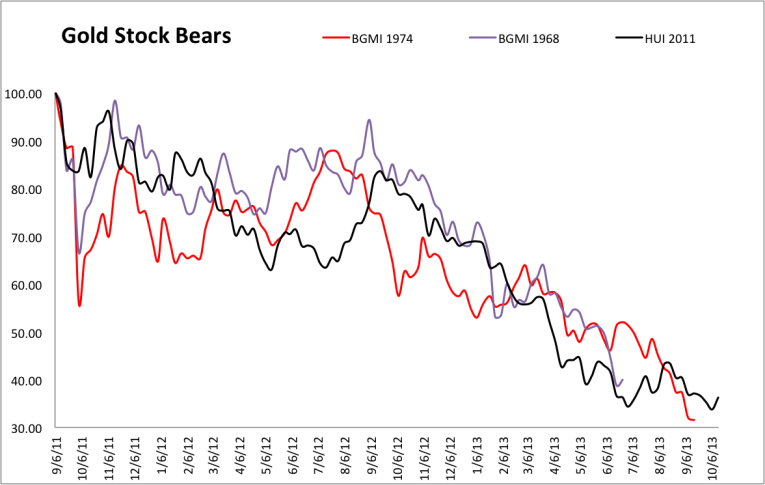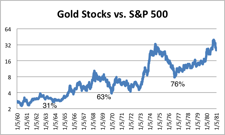 Just like from 1974 to 1976, the gold stocks from 2011-2013, when measured against the S&P500, have declined 77%.