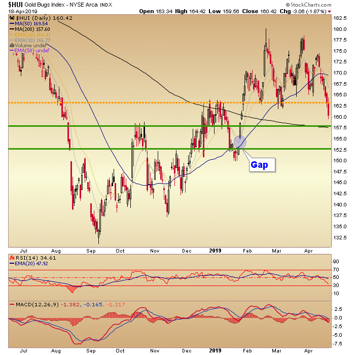 Today Huey dropped through initial support on the daily chart and NFTRH has been tracking the SMA 200 (157) as a key support area. Below that has been the possibility of a gap fill at another lateral support area. Note that even there HUI would be in a ‘higher low’ posture, which is important.