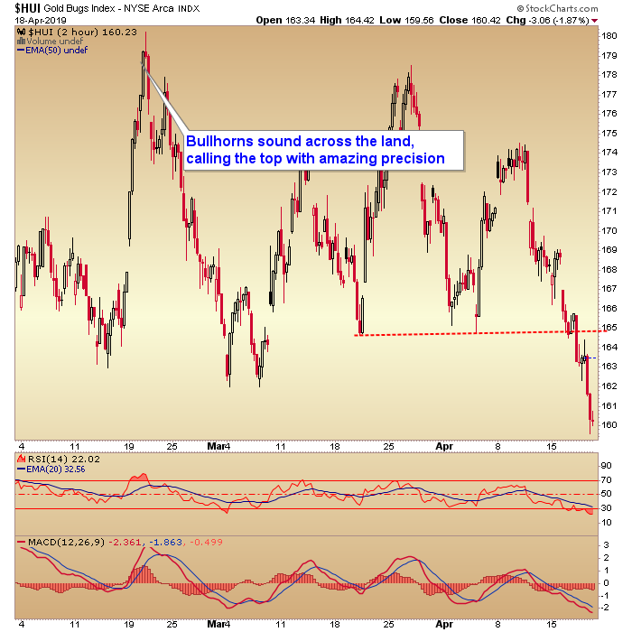 Before the promotional corners of the gold community start with the conspiracies, excuse making and general placing of blame everywhere but where it belongs, let’s simply note that this correction was indicated (by sentiment) as far back as February 22nd. On that day I made a post quoting three anonymous sources within the community, firing up the troops to be hyper bullish… as in a gold price of $1400 promptly before a “parabolic slingshot” on the way to $3000 off of a “gargantuan pattern” (that had not even appeared yet and was but a figment of a fertile imagination).