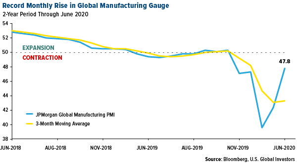 I say this with caution, but there could be some good news ahead. The JPMorgan Global Manufacturing PMI, which tracks manufacturing activity around the world, posted a 47.8 in June. Although that doesn’t quite indicate expansion, it means that factories are contracting at a much slower rate than they were in the two previous months. What’s more, June’s gain was the strongest on record for a single month, up 5.4 points from 42.4 in May, indicating a recovery could be underway.