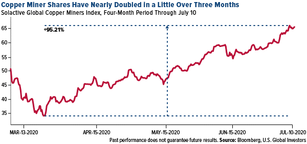 China’s manufacturing PMI reading in June, at an expansionary 51.2, was its highest for 2020 so far. As the world’s largest consumer of base metals, China’s improvement is highly constructive for the group. Zinc posted its biggest weekly gain since 2016, advancing 8.22 percent, largely in response to the positive news. Copper, meanwhile, has surged some 33.5 percent since its 52-week low of $217 a pound on April 21. Copper miners, as measured by the Solactive Global Copper Miners Index, have fared even better, soaring more than 95 percent since its recent low on March 23 as Chinese copper smelters crank up production.