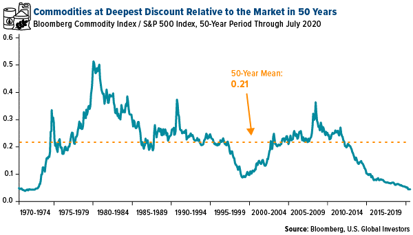 Below is the ratio between the Bloomberg Commodity Index and the S&P 500. What it shows is that raw materials, and particularly energy, are at their deepest discount relative to the market in half a century.