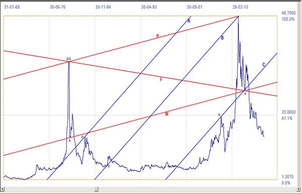 Line F, also from the top on the left, has a gradient that is shallower than the gradient of line M by the Fibonacci ratio, 1.618034. It misses the second point of line M by 0.04%, 33 years after its point of origin. Two similar spike tops served as points of origin for lines A and C. Their gradient is also derived from that of master line M. Line B has its origin in an ‘elbow’ during the long flat trend, but then passes ay 0.15% from the second spike top, to make it a unique trend line.