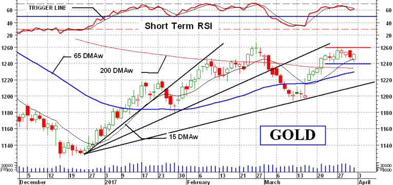 As we see on the chart gold closed above its positive sloping short-term moving average line and the momentum indicator is in its positive zone, although showing some weakness remaining below its negative trigger line. For now the short-term rating is BULLISH, which could change very fast should gold drop below that “box” support at the $1240 level.
