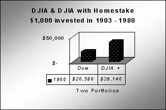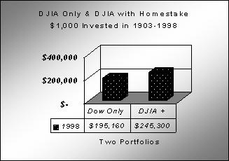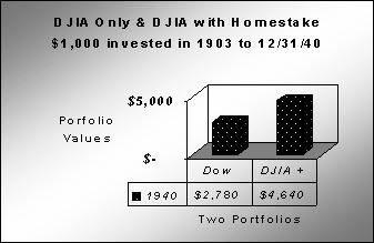 Portfolios choosing the DJIA and the one with DJIA + Homestake were started in 1903 with an assumed $1,000 initial investment.