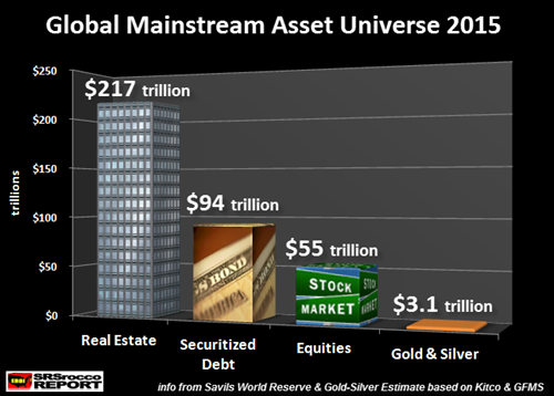 Thus, the collapsing oil price will destroy the value of most physical and paper assets, BUT NOT GOLD & SILVER. Here is a chart of the “Global Asset Universe” by the Savills Research Group Report: