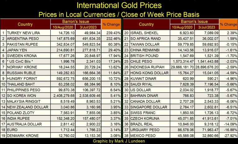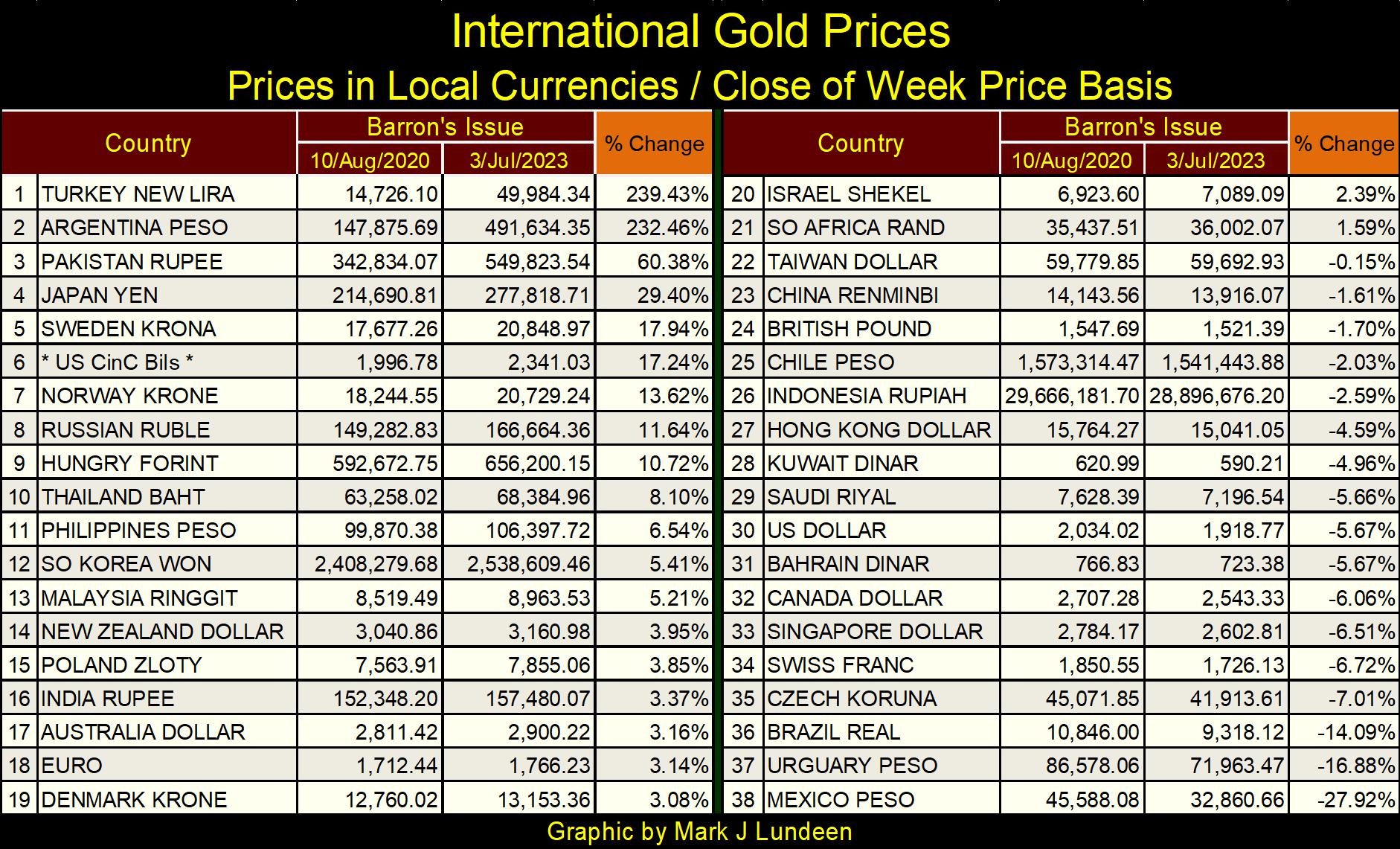 I used data from Barron’s 10 August 2020 issue as a base (the last Barron’s issue where gold saw a weekly all-time high in US dollar terms), to compare with this week’s data. I was curious if other currencies, unlike gold in US dollars (#30 below), have seen gold increase above their highs of August 2020. Some have, in fact 21 have in the table below. Some by a little, like the Israeli Shekel (#20; up by 2.39%), others by a lot, like Turkey’s New Lira (#1; up by 239.43%).