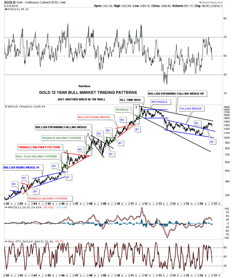 This next chart is a weekly chart for gold which I call, JUST ANOTHER BRICK IN THE WALL, which shows all the consolidation patterns that formed during gold’s bull market years from 2000 to 2011. I’ve always said this was one of the most beautiful bull markets of all time. Put yourself in anyone of those bigger consolidation patterns to get a feel of what it would take to hang on during the consolidation process. What’s important to notice is that gold never made a lower low except during the 2008 crash low as shown by the black bullish expanding falling wedge. If you look real close you can see little green triangles that formed halfway in many of the impulse moves up.