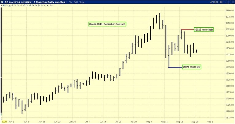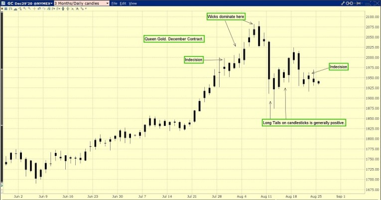The “Queen Gold” December futures chart. When candlesticks have both “wicks” and “tails”, a period of indecision is likely in play.