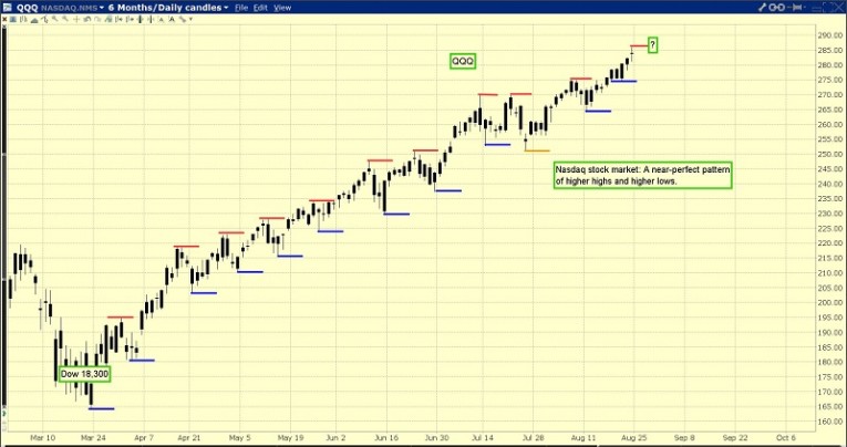 The US stock market chart. From my Dow 18,300 giant buy zone, the QQQ ETF has staged a wondrous pattern of higher highs and lows, and until that pattern ends, investors can stay long… and strong!