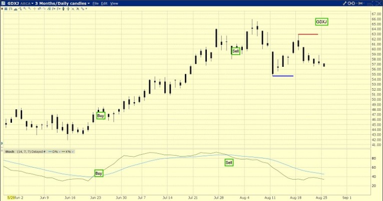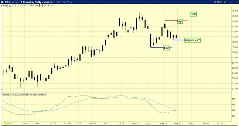 The GDX chart. The summer doldrums are in play for gold stocks. For the past four trading days, GDX has been trading in roughly just a one-dollar price range.