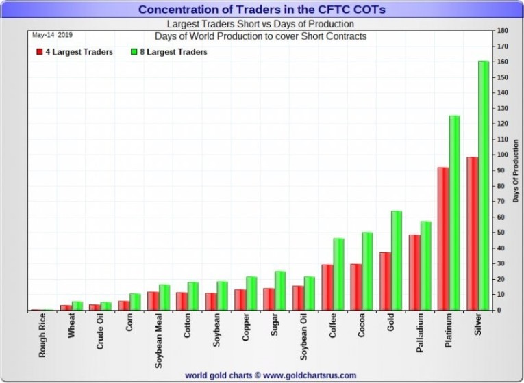 As you can see above, thirty-three Banks are included in the May 2019 Bank Participation Report, and their combined NET short position in COMEX gold is 83,132 contracts. While that may seem like a lot—and, at 8,313,200 ounces, it is!—that's a pretty small amount given their history. Click around on the link provided above and you'll find Bank NET short positions as high as 178,061 contracts in February of 2018 or 191,834 contracts in July of 2016. History will also show that a 26 Bank NET short position of 37,647 contracts in COMEX silver is about the historical average.
