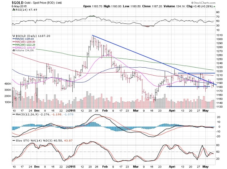 Gold gained 0.85% this past week and remains in its range. Consequently, there is nothing new to report. The trend remains lower and we are stuck in a range between $1,210 to $1,215 on the upside and $1,180 on the downside. A break either way could be bought or shorted but since the major trend remains lower, chances are that is the direction of the next move.