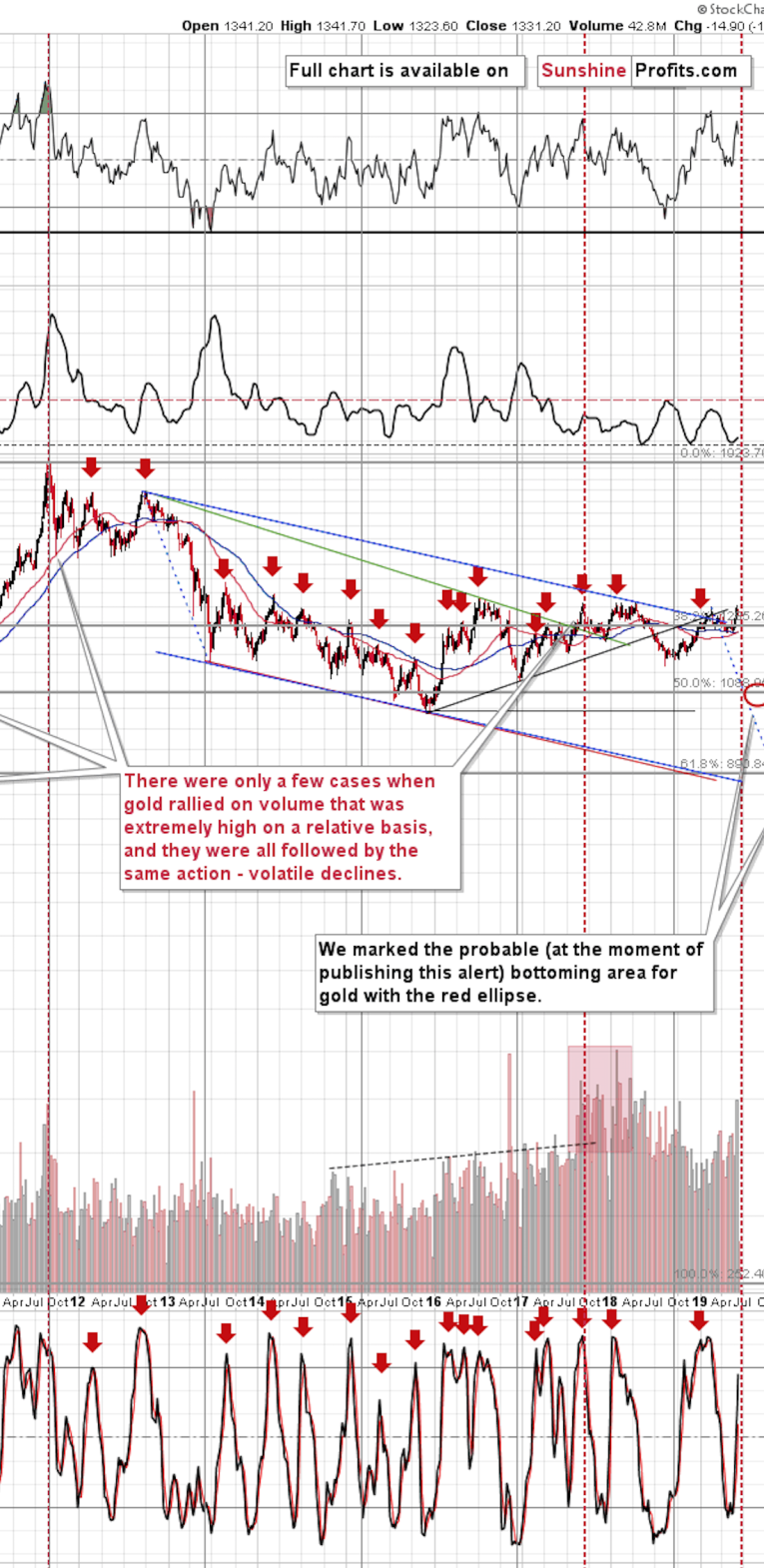 Just a few paragraphs above, we wrote about another huge-volume spike that would be visible on the next chart. It's the January 2018 spike. Its volume was higher than that of the mid-2017 spike, but overall the former seems more significant on a relative basis. Anyway, the January 2018 spike... Resulted in declines anyway. Not right away, but this was the end of the rally, so the bearish implications thereof remain intact.