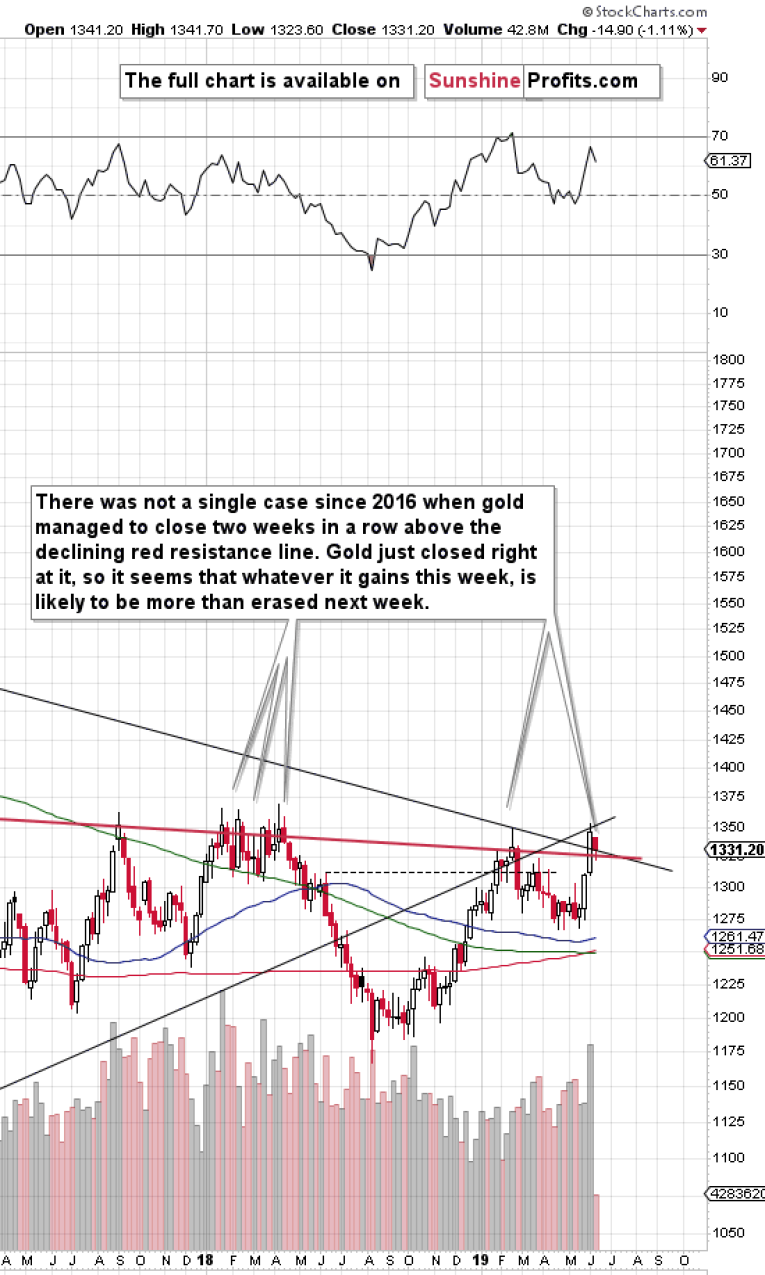 The above remains up-to-date. Since the previous week has indeed resulted in gold's close above the declining red resistance line, we are now likely to see breakout invalidation.