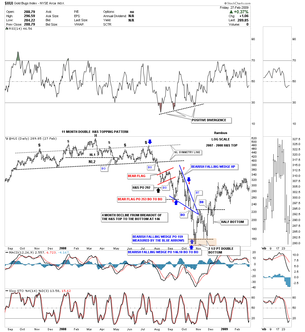 Back at the 2008 crash low in the HUI there was a reversal pattern, that is pretty rare, which helped confirm that very important low. If you ever wondered what the 2007 – 2008 top looked like and the decline that followed to the 2008 crash low this daily chart for the HUI paints the Chartology I posted at the tent, in real time, as the impulse move to the downside took place.