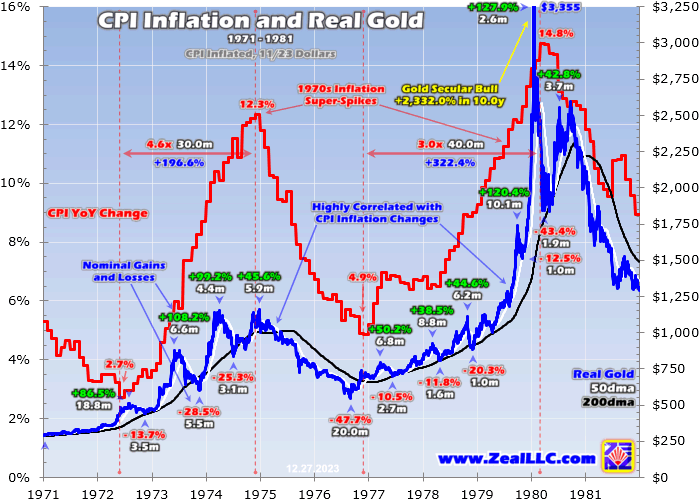 Gold’s real all-time-record high was seen in late January 1980, when prices skyrocketed to $850 nominal. That capped a mighty 10.0-year secular bull at life-changing 2,332% gains! That peak gold price inflated using the lowballed CPI as of its latest November 2023 print translates into $3,355 in today’s dollars! Gold won’t hit real records until at least that is exceeded, which is another 62% higher from mid-week levels.