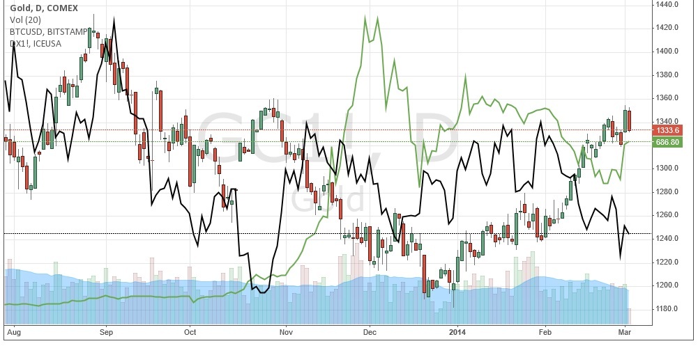 But Bitcoins and gold behave differently as the Dollar is debased by the Fed’s monetary actions. Bitcoin prices (green line) appear closely correlated to moves in the Dollar (blue line). Gold (candlesticks) tends to move inversely to the Dollar.