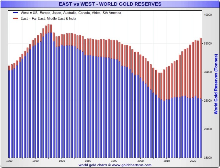 As the chart below shows, the West has reduced its gold reserves since the late 1960s, whilst the East is growing its gold reserves strongly. And we have just seen the beginning of this trend.