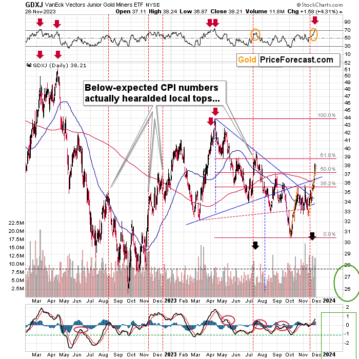 The RSI moved above 70 which is not only a classic sell signal, but also something that has worked many times. I marked the previous cases with red arrows, and as you can see, the implications were not minor. These were some of the top moments to be sticking to or entering short positions in the mining stocks, and some of the absolutely worst moments to drop short positions or enter long ones.